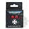 This is a set of 16 six-sided dice with squared edges for use in games of Warhammer 40,000, themed around the Black Templars. They are cast in pearlised black and grey swirl acrylic plastic with red ink markings, and measure 16mm along each edge. The 1-5 facings are traditionally pipped and each '6' face is decorated with the faithful icon of the Black Templars.